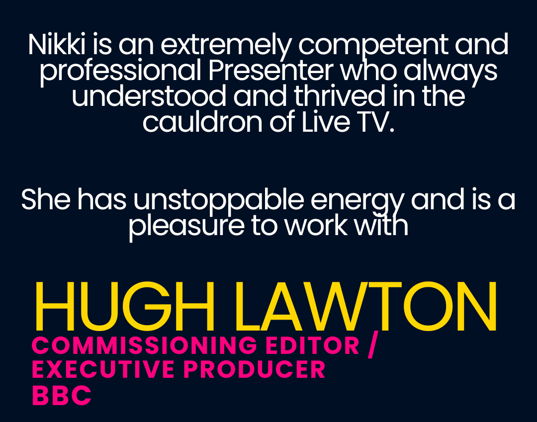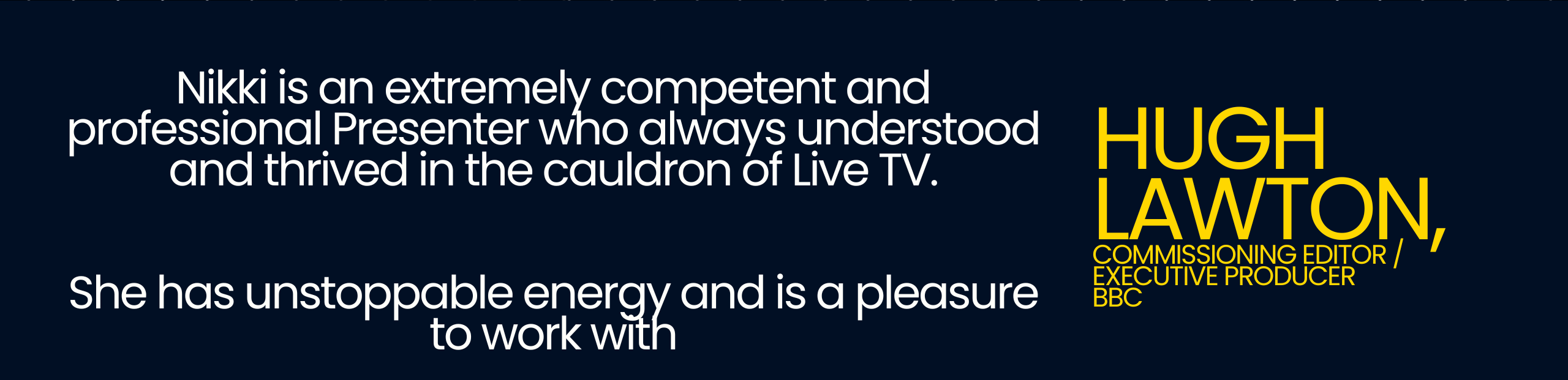 Nikki is an extremely competent and professional Presenter who always understood and thrived in the cauldron of Live TV.